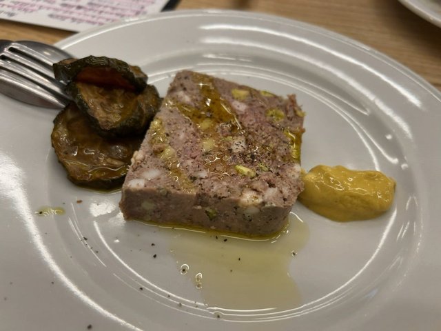 豚すね肉のホロホロ感と豚脂、白肝のつなぎねっとり感、ピスタチオなど、濃厚感バランスよく、これもお酒のアテとしてピッタリ。