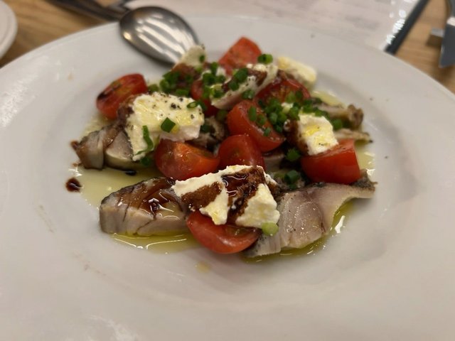 ここから前菜あれこれ。大体どれも一皿2~3人分のポーション。魚マリネ系は他魚種いろいろありましたが、こちらは炙りサバのマリネ、リコッタチーズとバルサミコ。けっこう脂の乗ったサバをさらに炙って脂風味立たせ、それにリコッタやバルサミコ酢との調和で美味。
