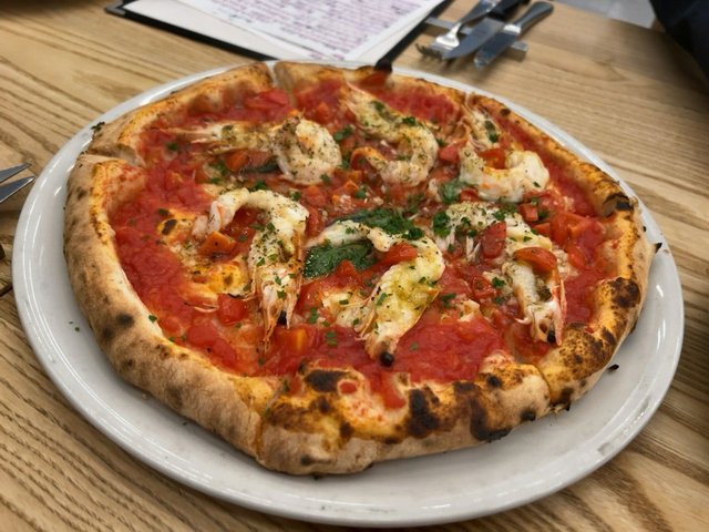 こちらは天使の海老とプチトマトのマリナーラ。シンプルに海老の香ばしさとトマト2wayの味を楽しむピッツァ。円周の分厚め生地の香ばしさ、中心部分の薄さと具材のボリューム感を存分に堪能。うめぇ~