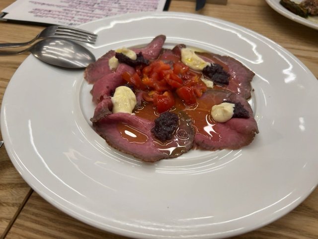 尾崎牛内もも肉のコールドビーフ仕立て。わりときめ細かい赤身肉質の尾崎牛を完璧な火入れでやわらかく仕上げたスライスビーフ。その上にトマト、リコッタ、飴色オニオンペースト、オリーブオイルとともに。オニオンペーストの甘みがいいアシスト。