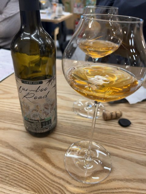 バンブーロード2023、ブドウ有機栽培品種5種ブレンドのイタリア産オレンジワイン。こちらも吞み口一瞬甘い風味を感じつつも、甘味なくフレッシュさと塩味ミネラル分。こんな飲み会ではなくゆっくり味わいたい美味しさでした(笑)