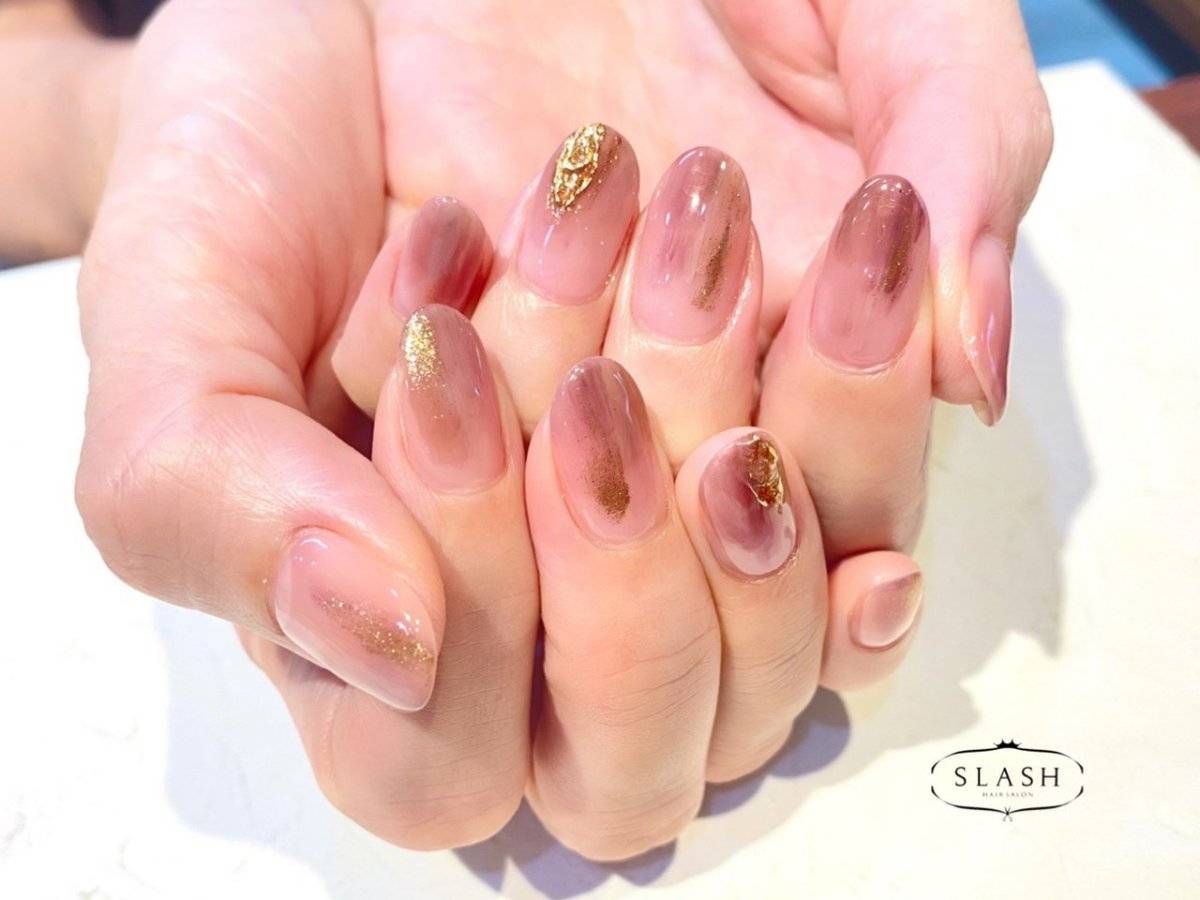 モーヴピンク、ブラウン、ゴールドの塗りかけネイルは、秋から初冬へ移り変わる季節にぴったりなデザインです。
