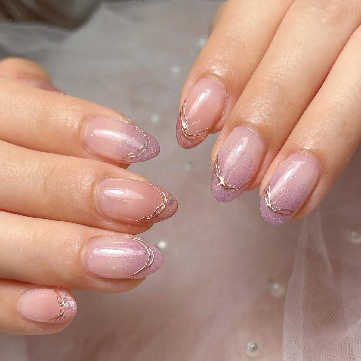ラメ入りのモーヴピンクでグラデーションネイルを作り、初冬ならではの煌めきを表現するのも素敵です。