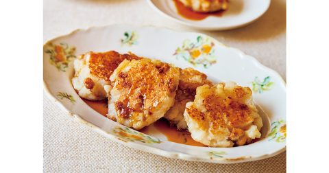 2 フライパンにごま油大さじ1を中火で熱し、1を6等分にしてスプーンで丸く入れる。3~4分間焼き、色づいたら上下を返して同様に焼く。水大さじ1を回し入れてふたをし、約1分間蒸し焼きにして、器に盛る。