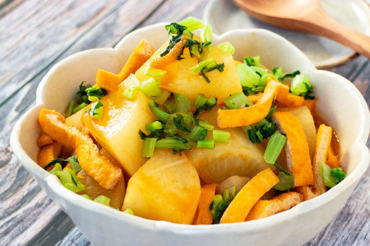 ③ 鍋に①、油揚げ、【A】を入れて中火で5分ほど煮る。大根に味が染みたら火を止める。器に盛り付けて②をのせたら、完成!