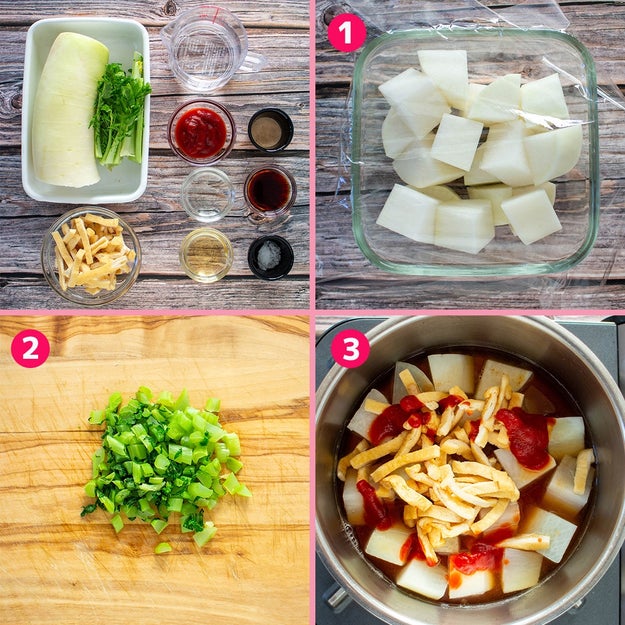 ①大根は厚み2cmのいちょう切りにする。耐熱容器に入れてラップをかけ、600Wの電子レンジで5分加熱する。