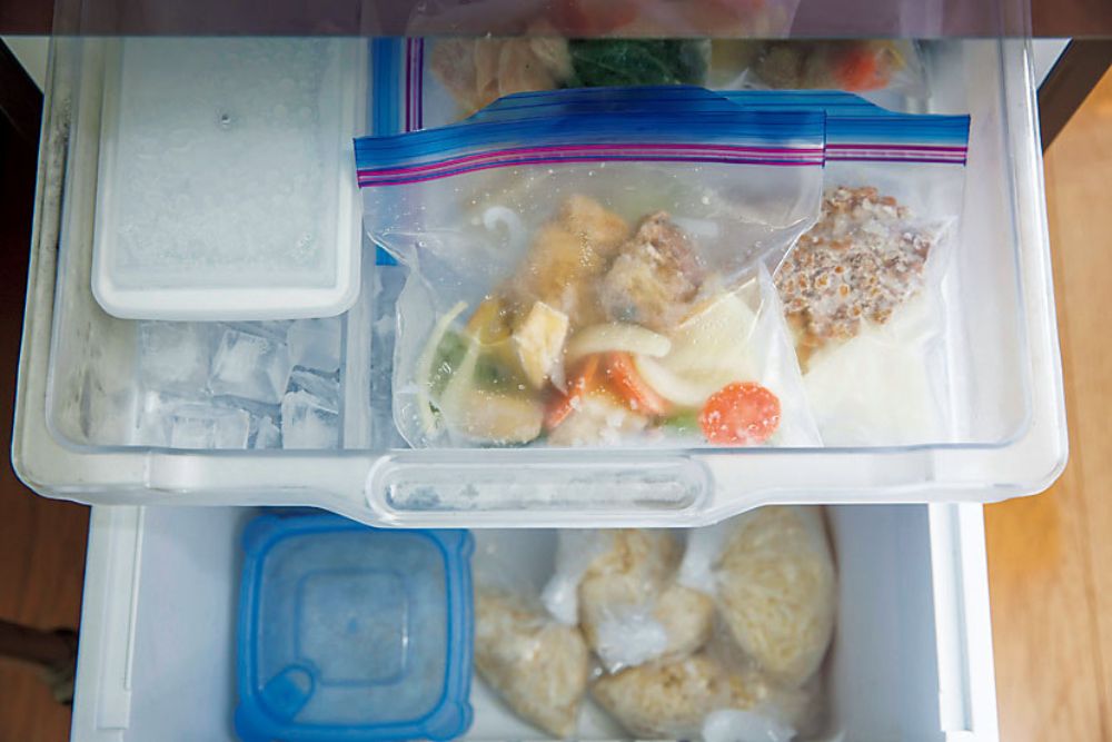 電子レンジで加熱してすぐに食べられる、1回の食事に必要なタンパク質食材50gと野菜100gを小分けして冷凍。