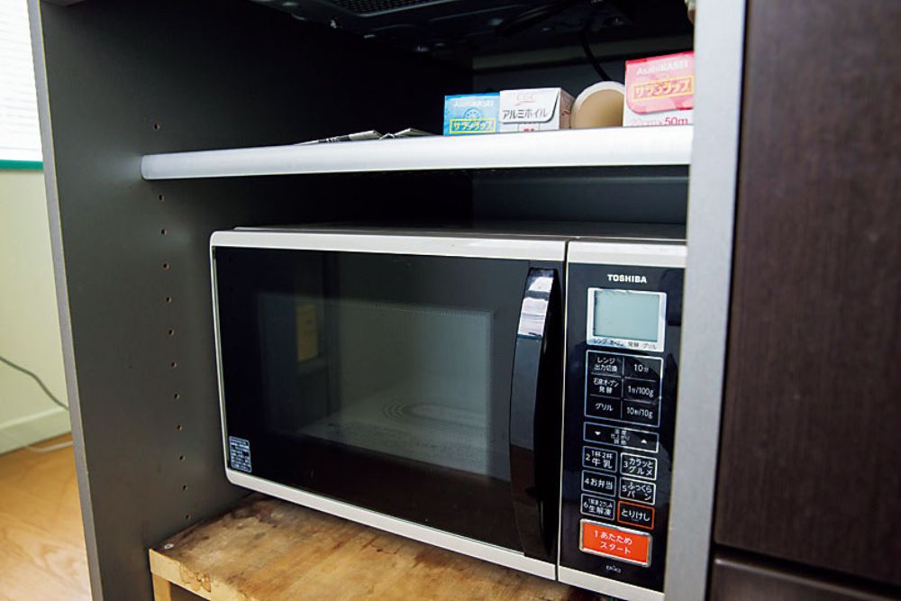 カウンターの裏側に扉なしの棚を設え、電子レンジを収納。