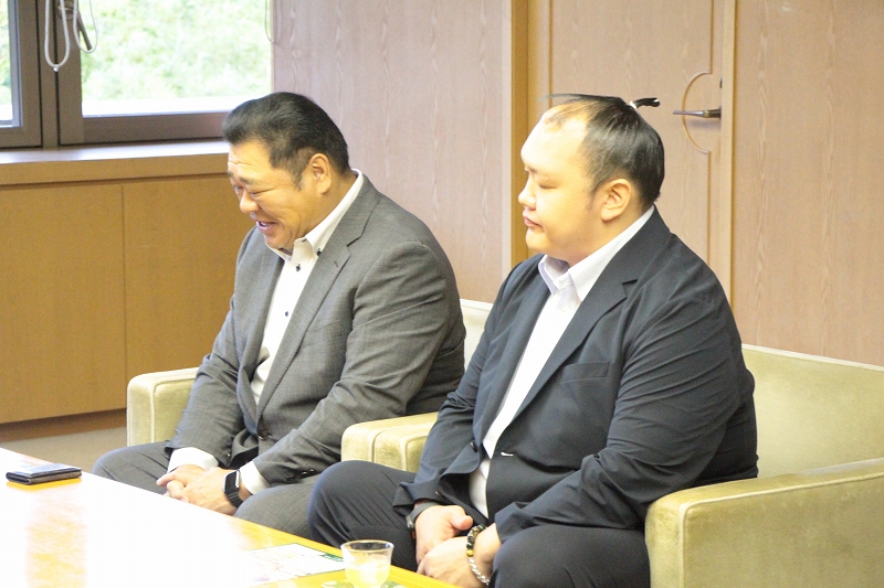 それに伴い、令和7年10月6日(月)に令和7年五月場所をもって引退された所沢市出身の大山親方(元・北勝富士関)が巡業部の枝川親方と市長面会を行いました。