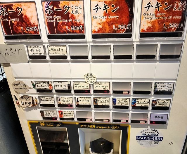 扉を開け、右手を向くとこの券売機がお出迎え。カレーはポーク、チキンの2種で各¥1200、大盛りが+¥100アップ、更にトッピングは、「酢玉子」¥150、「大根味噌漬け」¥100!という潔さ100%!のシンプル構成。合いがけシステムはありません。