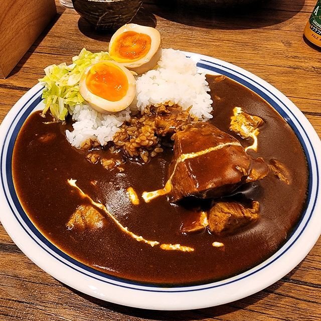 ワタシは「ポーク」¥1200+「酢玉子」¥150でお願いしました。これは欧風カレーの系図に当たるものでしょうな。丁寧に採ったブイヨン、しっかり煮込まれてソースと一体化している香味野菜、それに見たまんま超巨大な、「ホープ」の箱ぐらいありそうな煮込み豚肉が1個ででーんと、普通のカレーサイズの豚肉もいくつか!と言う構成。