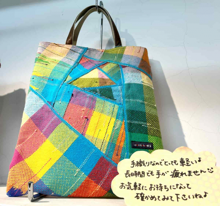 工房では、利用者さんが織られた作品の販売もされています。 実際に来店されていたお客様からは、「他の工房よりも仕上げが丁寧で、手に取ると高級感がある」といった声も。バッグの持ち手に革素材をあしらうなど、デザインの工夫も効いていて、普段使いしやすく、おしゃれに仕上げられています。
