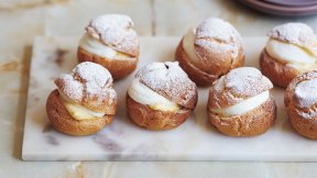 10. シューの側面の中央より少し上から、やや斜めにナイフで切り込みを入れる。【8】をボウルに取り出してゴムべらでなめらかになるまで混ぜ、シューの下部にスプーンでたっぷりと入れる。きれいにした丸形口金をつけた絞り袋に【9】を入れ、【カスタードクリーム】の上にたっぷりと絞り入れる。シューの上部でふたをし、粉砂糖を茶こしでふる。