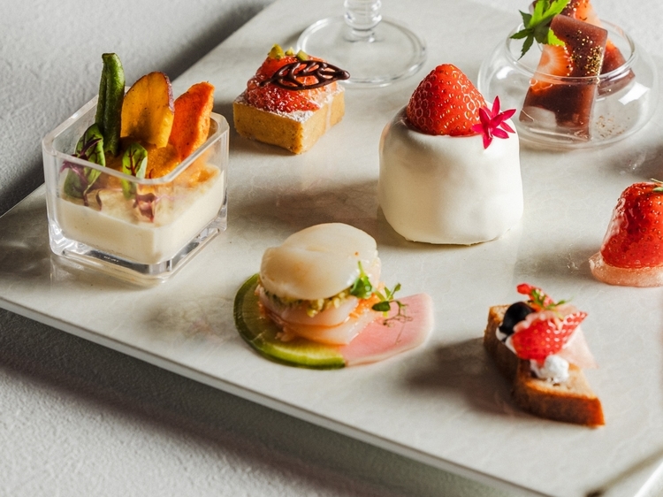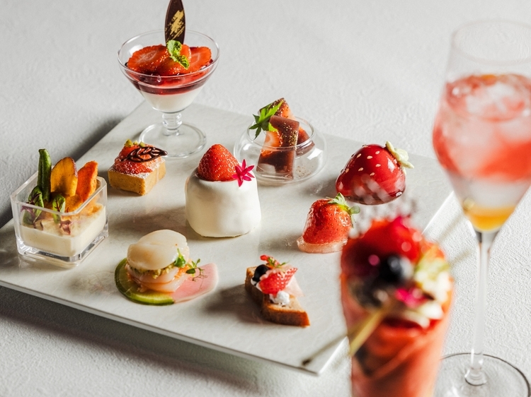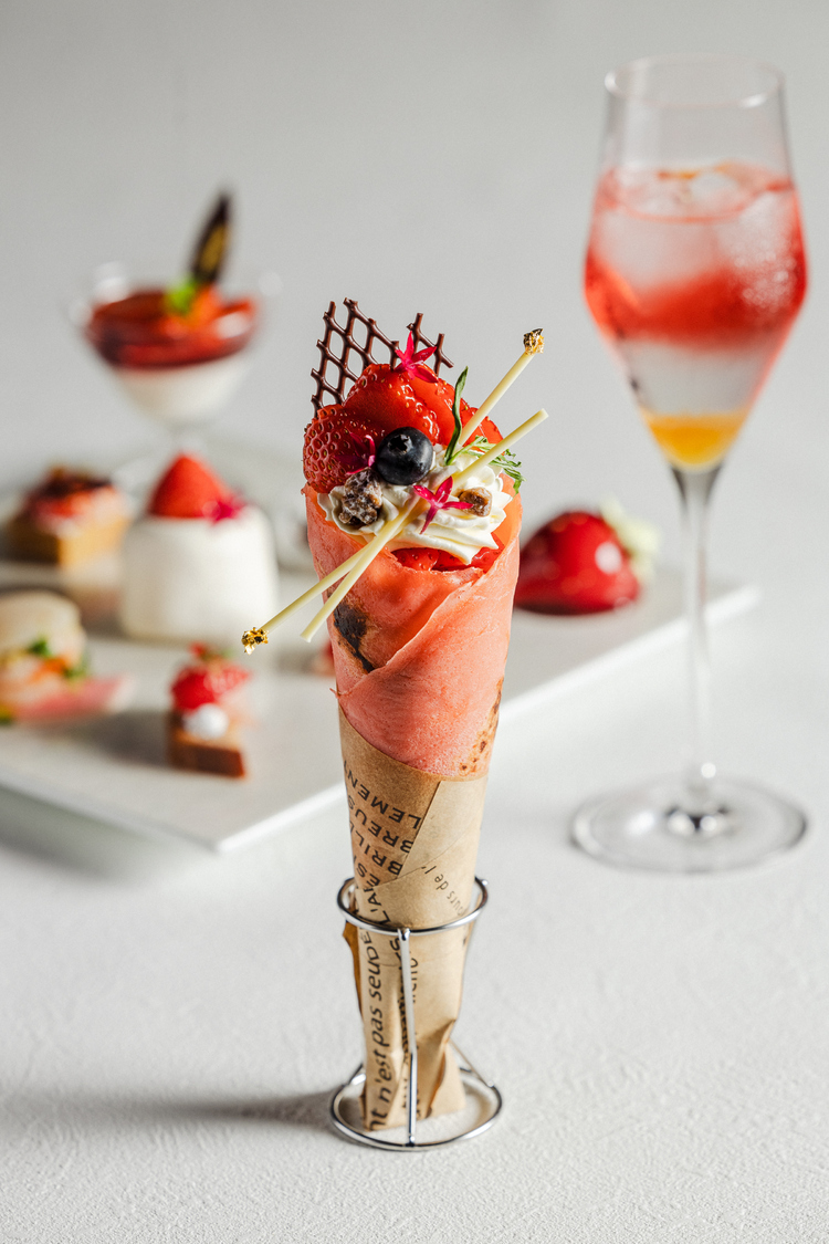 こちらは「『いちごの芳醇な香りと多彩な味わい、豊かな食感が奏でるシンフォニー』をコンセプトに、甘みと酸みのバランスに優れたいちごをふんだんに使用した愛らしいプティフールと、冬の旬な食材が織り成すセイボリーが彩りを添える、華やかなアフタヌーンティー」。ホテルの特性も活かし「水ようかん」など“和”のテイストも取り入れたスイーツは、どれも可愛らしいいちごが主役となった、見ているだけでも顔がほころぶものばかりです。