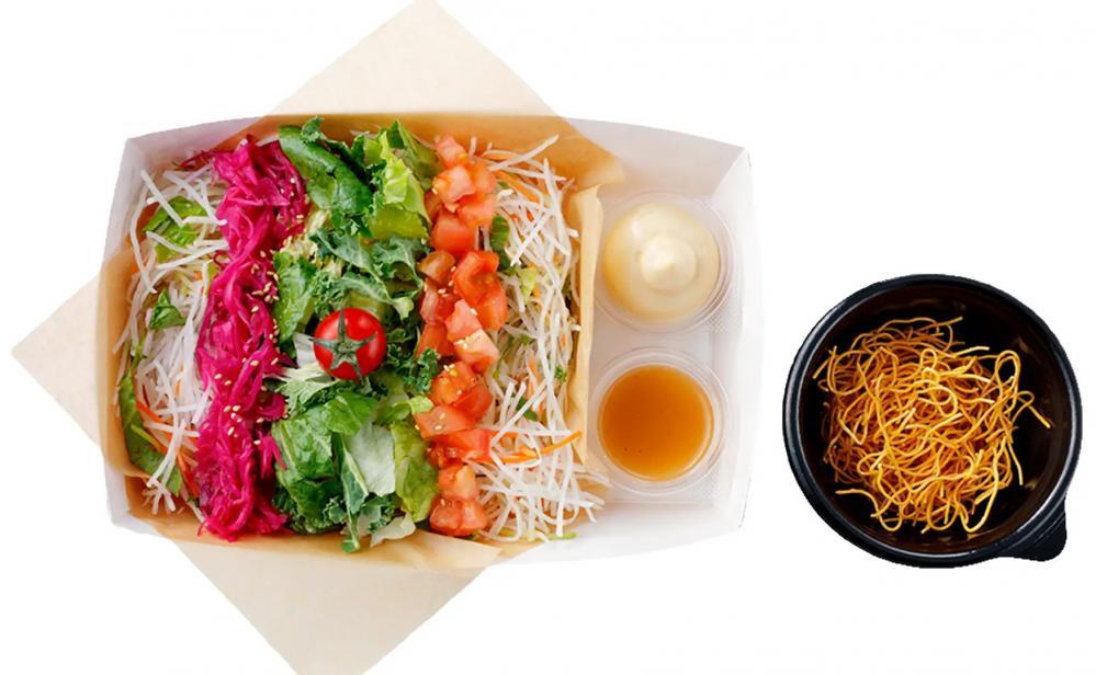 新鮮な10種類の野菜と、パリパリ麺がアクセントになったサラダ。特製ドレッシングと相性抜群です。