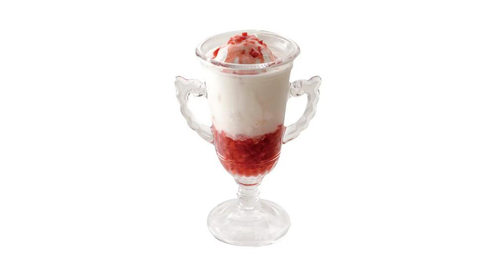 甘酸っぱいイチゴと、濃厚なミルクのバランスがたまらない大人気ドリンク。北海道ソフトクリームもトッピングされています。