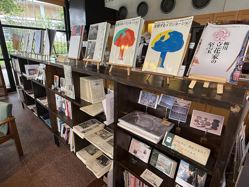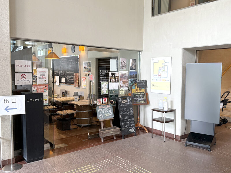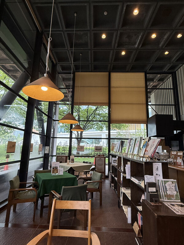 高い天井なのは、美術館のエントランスの軒裏がそのまま生かされているから。お店の天井がそのまま外まで繋がっているのが写真からもおわかりいただけると思います。