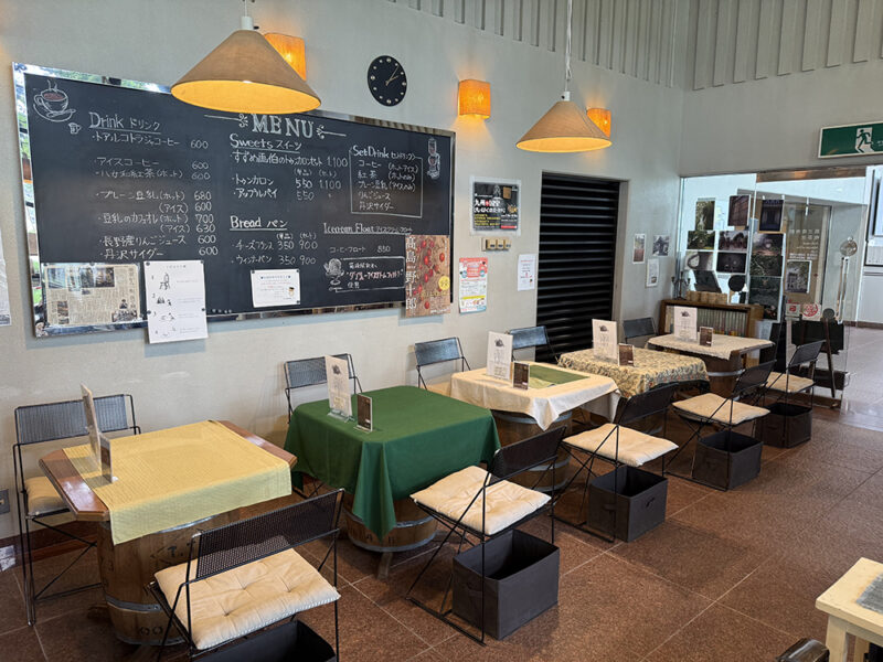 そのほか、木の樽をテーブルの足として活用している席もあります。