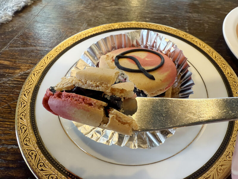 トゥンカロンは通常のマカロンよりひとまわり大きいサイズで、中に特製のクリームがサンドされています。フォークを入れるとこのように形が崩れやすいので、手にとって食べるのをおすすめします。
