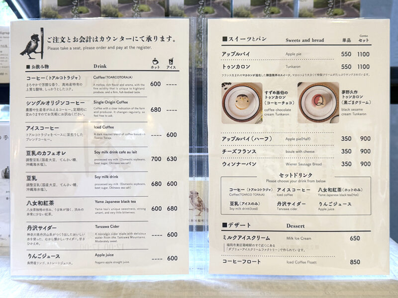 サイフォン式で抽出するコーヒーのほか、豆乳や和紅茶、丹沢サイダーといったドリンクから、人気のアップルパイやトゥンカロンなどのスイーツ、チーズフランスやウインナーパンなどがラインナップされています。
