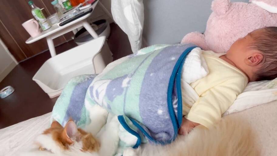 クッションに体を預けながら、片足をピーンと伸ばして眠る猫ちゃん。一方、もう1匹の猫ちゃんはそんな大胆な寝相を気にすることもなく、スヤスヤと夢の中…。寝相は違えど、どちらも安心しきった表情をしており、お互い信頼し合っている様子が伝わってきます。