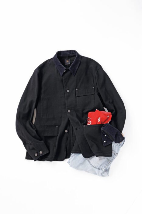 トリプルステッチやリベット補強といったワークウエアならではのディテールを備えつつ、ポリウレタンを混紡した生地を用いることで快適な着心地を両立。6万500円(マスターピースショールームTEL03-6407-0117)