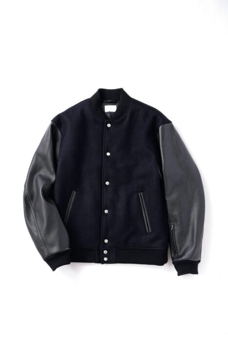 トラッドには欠かせないバーシティジャケットをスマートな印象に仕上げた。身頃には肉厚のメルトン生地、袖にはしなやかで光沢のある牛革を使用している。12万1000円(ソフ トーキョーTEL03-5775-2290)