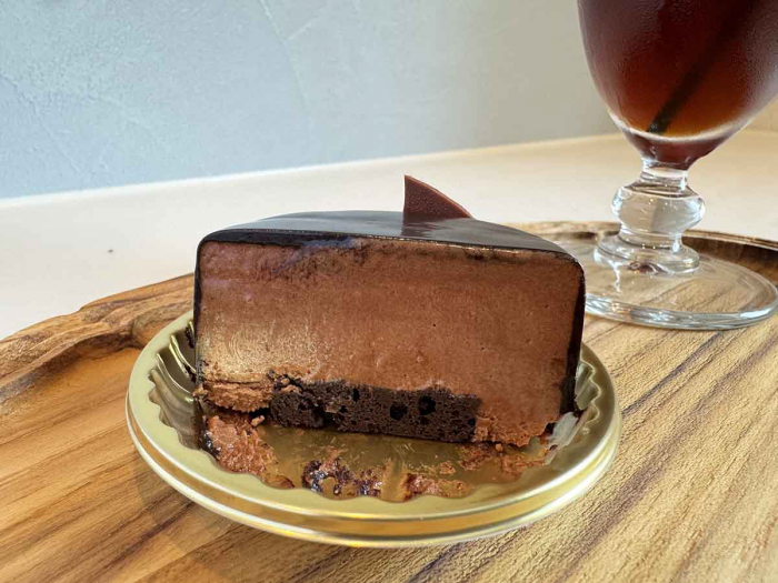 グラサージュ、チョコムース、チョコ生地のシンプルな構成で一番下の層のガトーショコラは米粉で作られているグルテンフリー。控えめな甘さがちょうどいい感じでコーヒーとのバランスが抜群。それぞれの素材の魅力を活かして作られた味わいが絶妙ですごく美味しいです。
