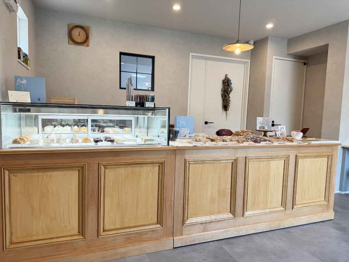 店内はブルーグレーと木を基調としたおしゃれで落ち着いた雰囲気で、ショーケースには生ケーキと焼き菓子がずらりと並びます。