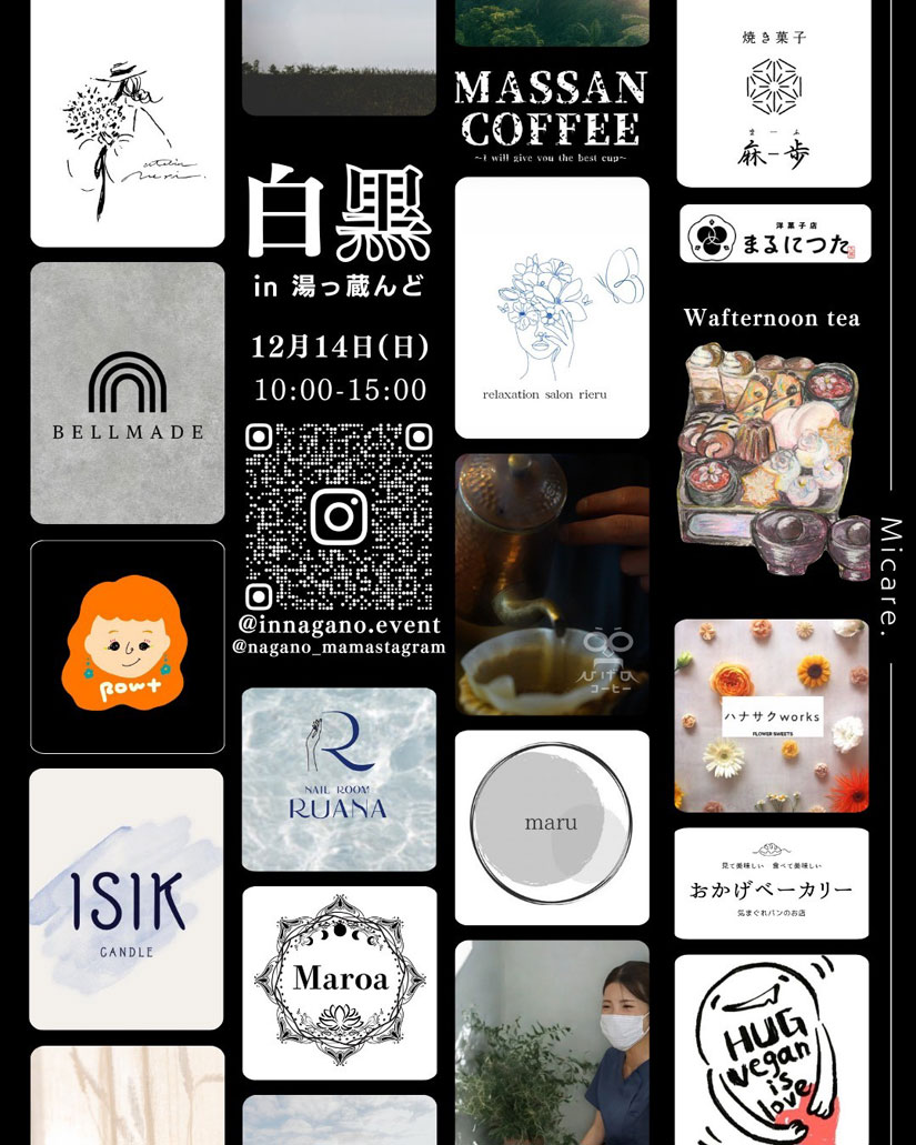 2025年12月14日(日)に長野県須坂市の日帰り温泉施設「関谷温泉 湯っ蔵んど」で『BLACK & WHITE』が開催。白と黒をテーマにしたイベントで、スイーツや雑貨、リラクゼーション、クラフトなど15店舗が集まります。白と黒の世界観を軸に、「整う・余白・シンプル(しずけさ)」を五感で楽しめます。