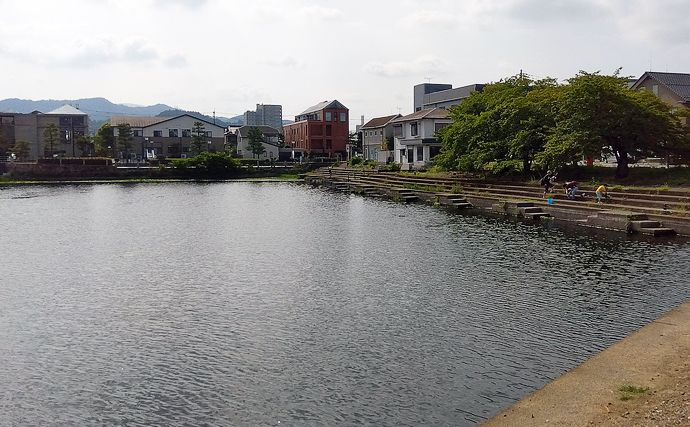 サイズアップを目指して彦根旧港の次に向かった朝妻湊跡では、8月上旬、釣り仲間がソルトのルアーを試投して50アップを出しました。朝一は湖北で何本か抜けてしまい、失意の中で真っ昼間に立ち寄ったそうです。私の下見でも足元にブルーギルやバスがいて、自分の身体と同じサイズのルアーを追いかけてきました。