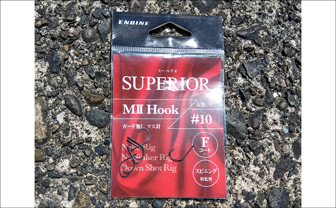 ただカズ親子が行ったイシグロにはバマスフックが無く、店員さんに勧められたというENGINEのスーペリオ、MⅡHookを使用。バス釣り用に開発されたケン付きのマスバリであり、マスバリの進化に感動しました。ノーシンカーのワッキー掛けでいざ勝負!