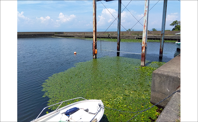 長浜港で気になったのは、遊覧船が出入りする港西側のウィードがかなり成長していて、台風や大雨で強い水の流れが生じない限り、今年は巻き物がやりづらい状態です。港南側は例年通りのウィードで、やや沖目から足元まで魚が入っていそうです。