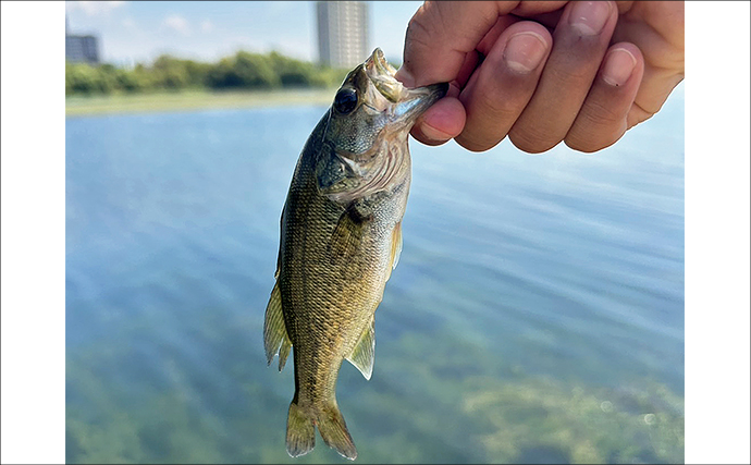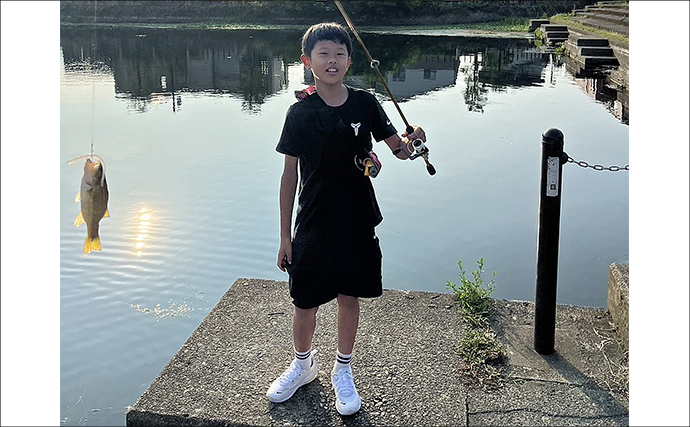 その様子を見て、シュウトくんはポッパーの練習を中断して、お父さんとタックルを交換し、仕切り直しの一戦。お父さんが「見えてるやつが釣れるから、ワームを上から落とすようにして」とアドバイスしたところ、待望の初当たりが来ました。当たってから取り込むまでは、日頃の釣りで鍛えられているようで、難なく取り込んだのはバスでした。お父さんの的確なアドバイスとバス釣り仲間の情報力、シュウトくんの腕前が合わさっての一匹に感動!