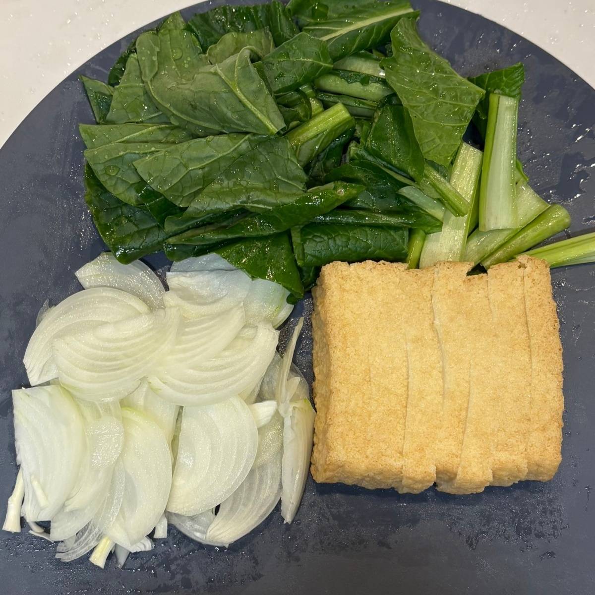 小松菜は5cm程度にカットし、玉ねぎは薄切りにしましょう。