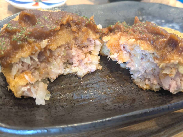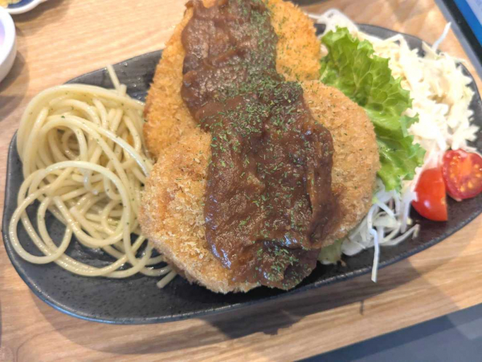 同じく火曜日のランチメニューの「メンチカツ」も人気とのこと。お皿からはみ出すくらい大きなメンチカツが2つものっていて、箸で持ち上げるとかなりの重量感を感じました。