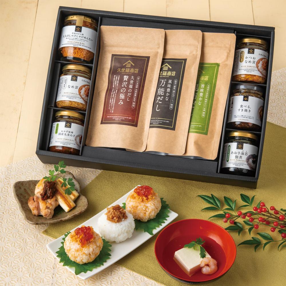 久世福商店の看板商品「だし」3種と、ごはんのお供6種を詰め合わせた豪華セット。料理好きな人への贈り物にも最適で、年末年始のごちそうシーンを華やかに彩ります。