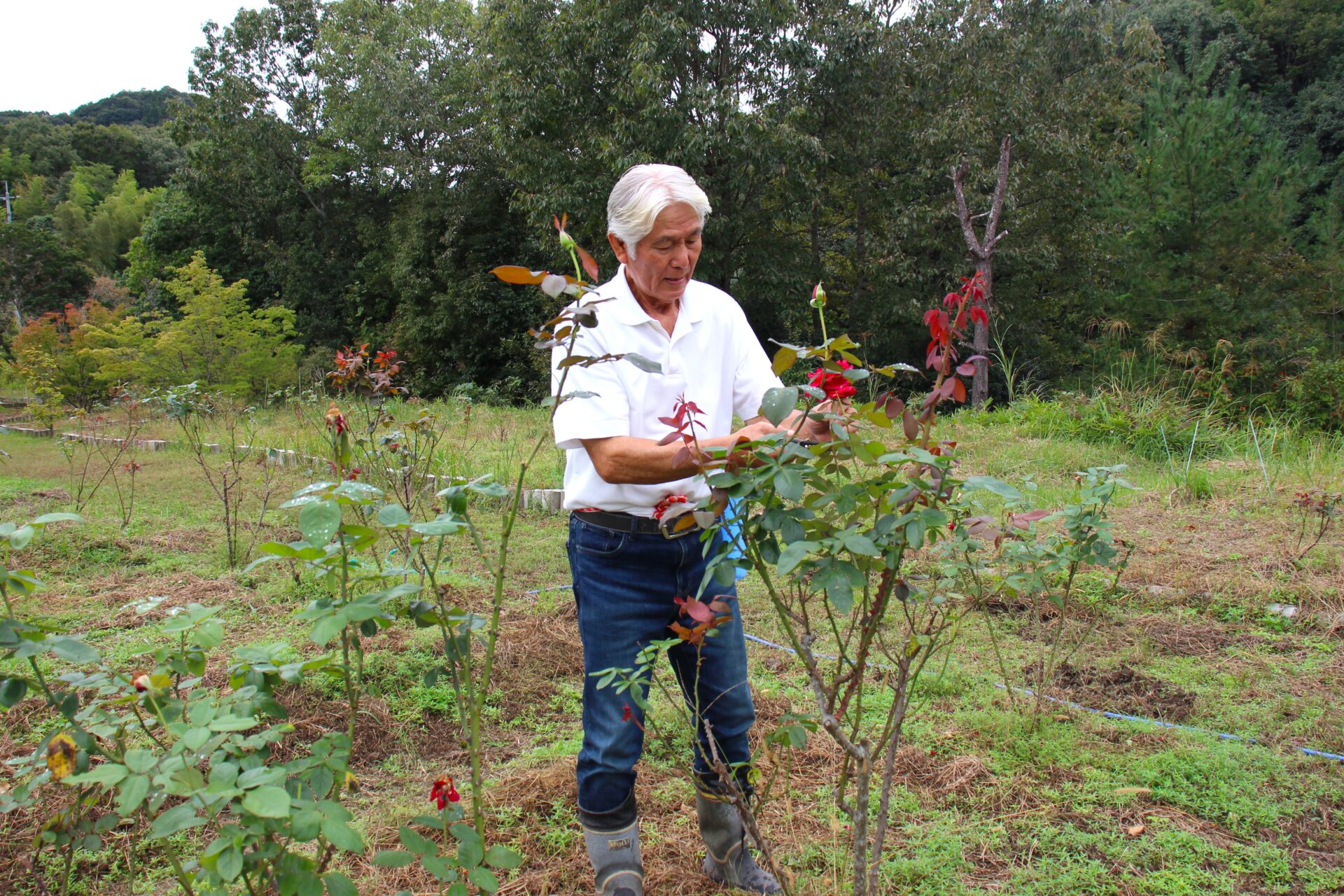 園内には栽培用のバラ以外に、ミヤコイバラやナニワイバラ、原種バラのモリイバラなどが自生していました。「こうした日本古来のバラを保存していくことも大切」など、体験中の会話からも義孝さんの哲学が伝わってきます。