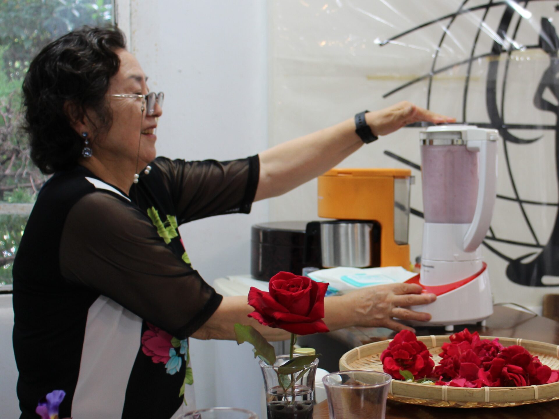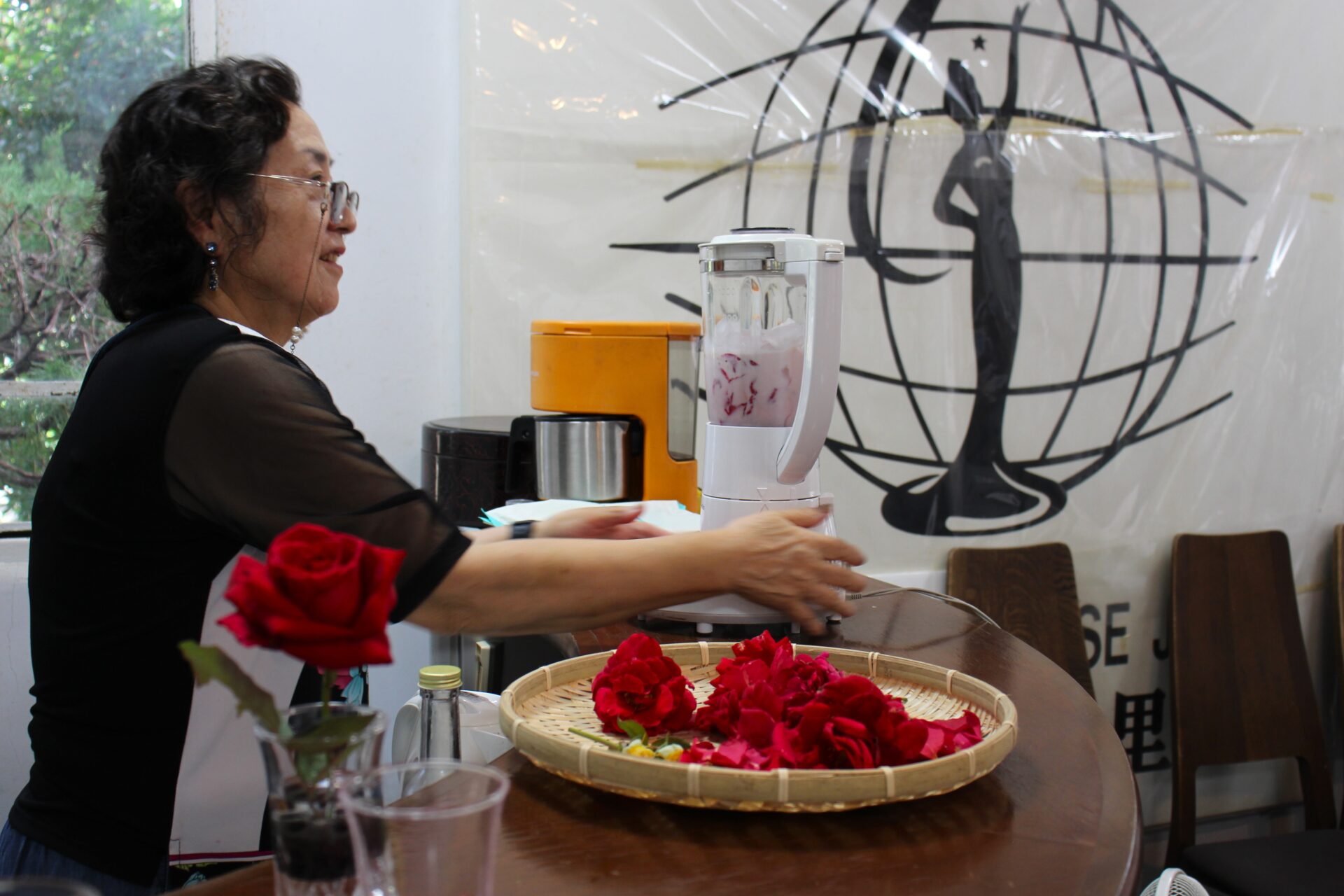摘んだばかりのバラをカフェに持ち帰ると、静子さんと一緒に花びらを摘み取って洗い、牛乳・バラジュース・氷を加えてスムージーを作ります。