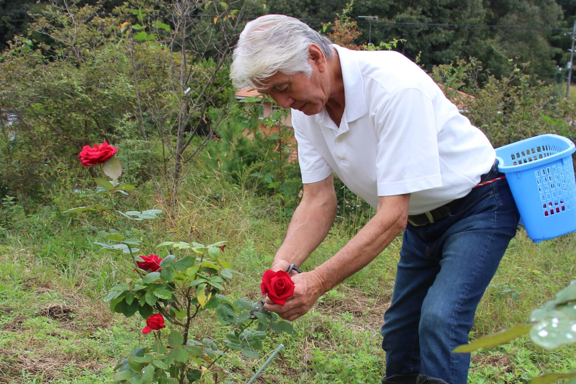義孝さんは「今年の夏は暑かったから、花付きが悪い」と言いながら、そのなかでも美しく咲いたバラを摘んでいきます。