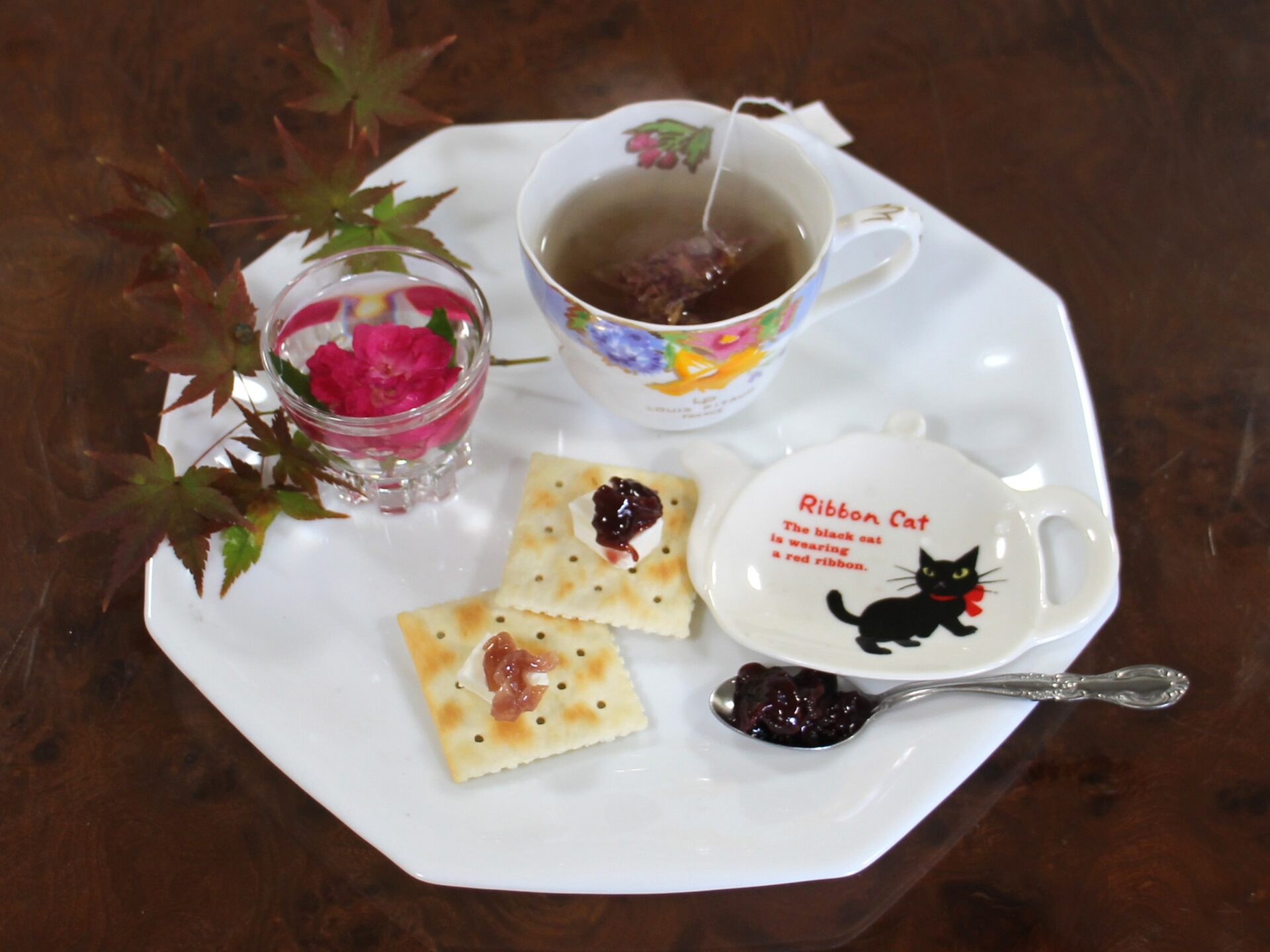 この日はバラの紅茶(バラのジャム付き)のほかに、生の食用バラをまるごと味わえるバラのゼリー、赤色とピンク色の2種のバラのジャムを味わえるクラッカーがセットになっていました。