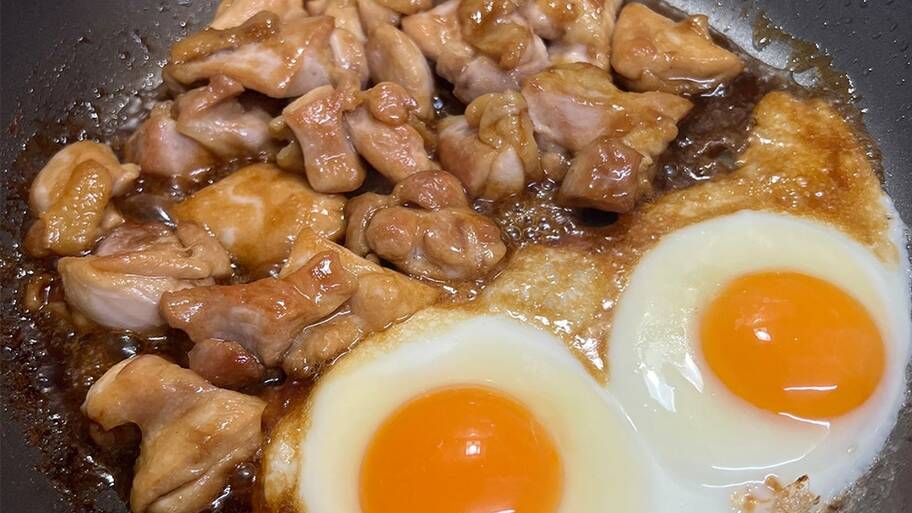 (5)ごはんに(3)をかけ、えのきたけのソテ―、半熟卵をのせ、パセリを散らす。