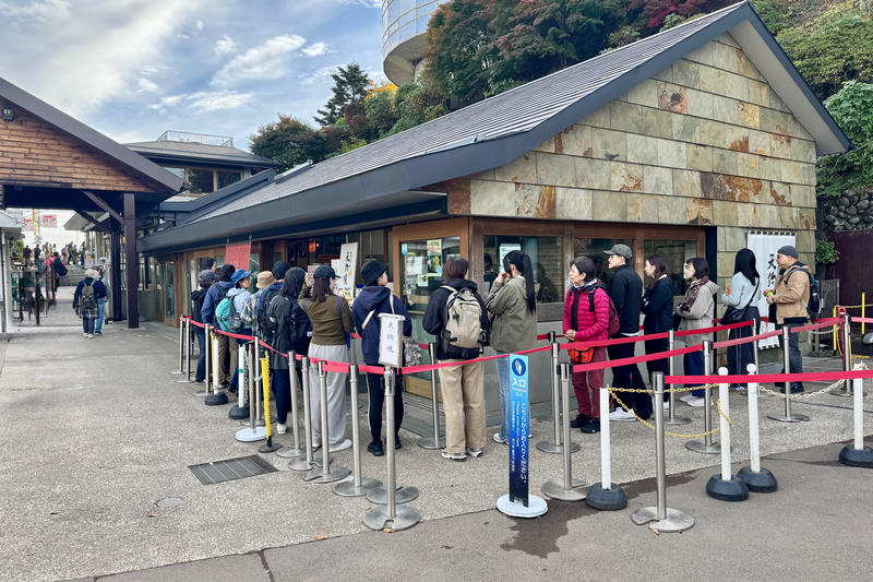 この場所に着いたのがちょうど10:00くらいでした。高尾山名物の『天狗焼』で有名な『天狗屋』さんを覗いてみると…なんと、開店と同時にこの行列!でも、回転も早いのでそんなに待たずに購入できそうです。
