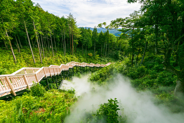 森の中を抜け、200段の階段を登り切ると、そこには「もりの雲海」と呼ばれる特別なスポットが! 1日に9回(各15分間)決まった時間にだけ森の中に雲海が出現し、ここに来た人だけが味わえる絶景が広がります。