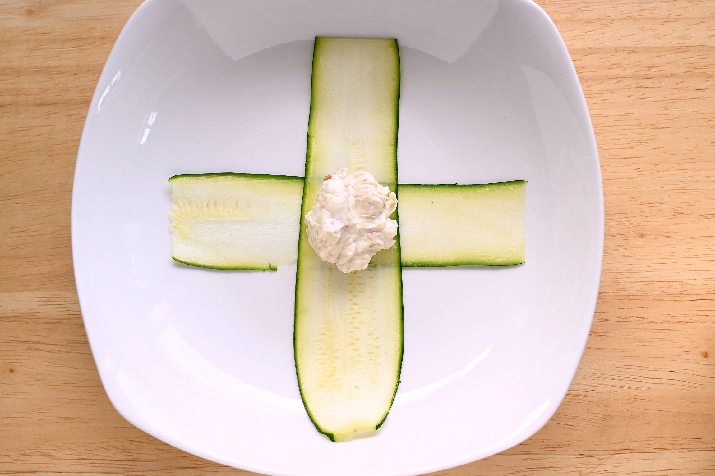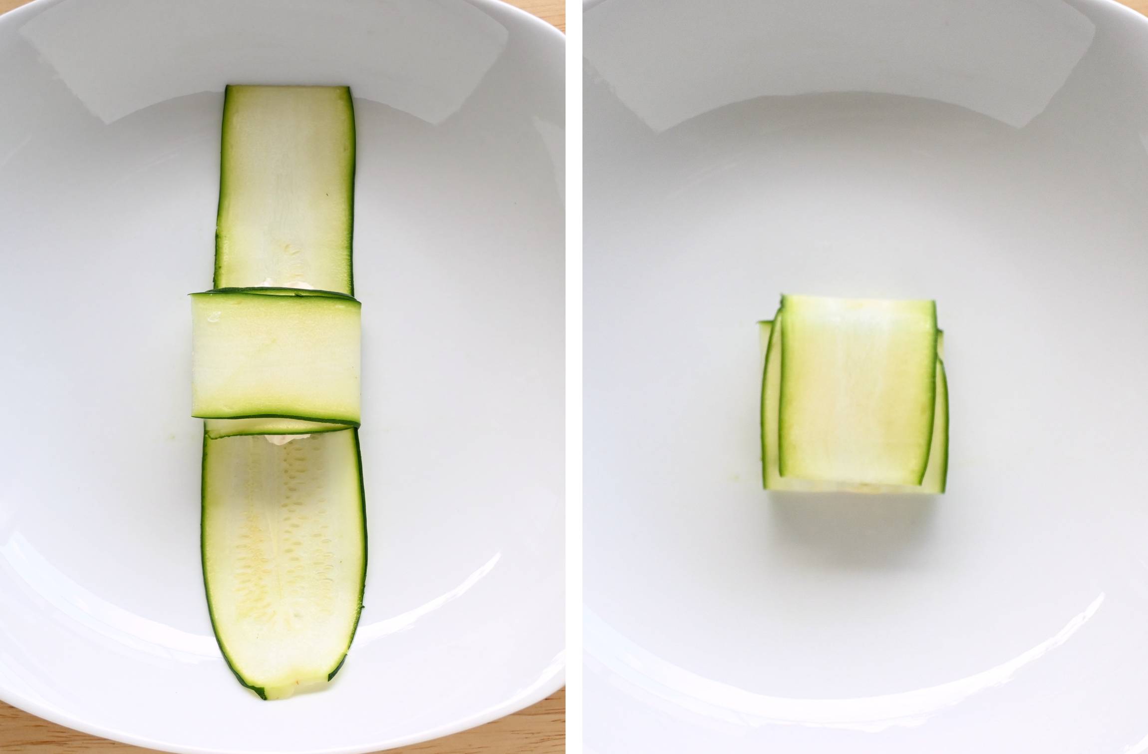 スライスしたズッキーニを、真ん中が重なるように横、縦の順に十字におき、フィリングの1/8量を真ん中にのせます。