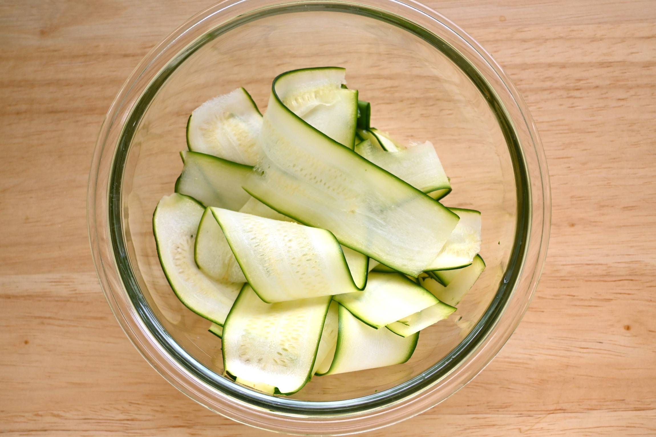 ズッキーニはピーラーやスライサーで、縦に薄切りにします。(16枚使います。残りはサラダや炒め物など別の料理に活用してください。)