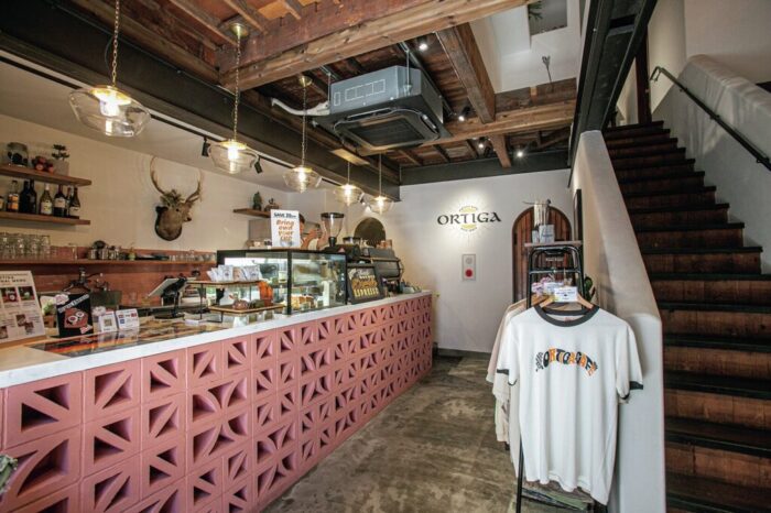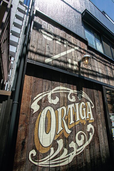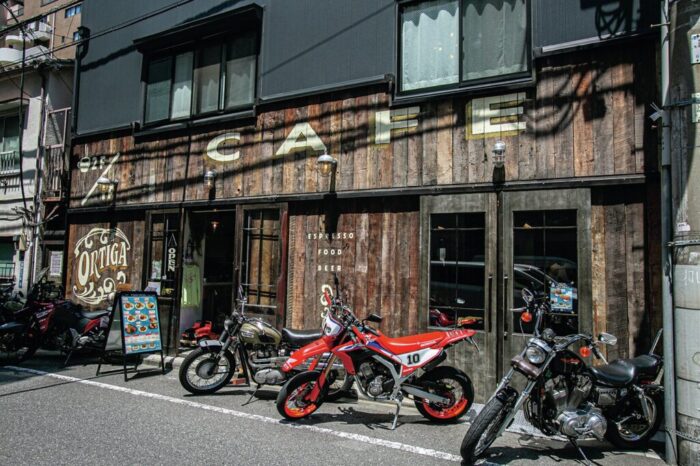 古材の壁が目印のオルティガ。外観や内装のペイントはShakin’ speedgraphixが手がけ、とてもモーターサイクルのカルチャーを演出。静かな通りだけれど、ひとりまたひとりとバイクに乗ってカフェにやってくる人気店。