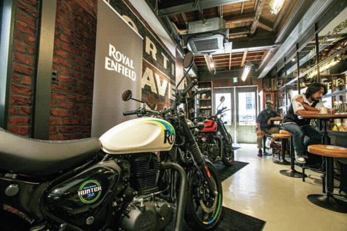 1階にはイベントスペースがあり、定期的に様々なイベントが行われる。この日はロイヤルエンフィールドの新型ハンター350の展示イベントを開催。バイクを眺めながらコーヒーを楽しむ人も。