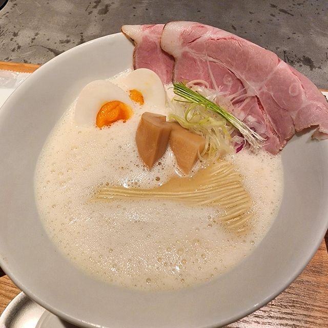 で、着席8分ほどで2人前のラーメンが登場。こちらがワタシ注文の「鶏白湯そば」セット¥1400+煮玉子¥150を追加した分。キッチン内でラーメンスープの仕上げにバーミックス(ハンドグラインダー)でういーん!とスープを泡立るのですが、そういうカプチーノ系クリーミーラーメンなわけで。具材は薄め大面積で超柔らかいレアチャーシューが2枚、角切りで歯ごたえの良いメンマが2個、白髪ネギに芽ネギ、追加した煮玉子!と言う布陣。