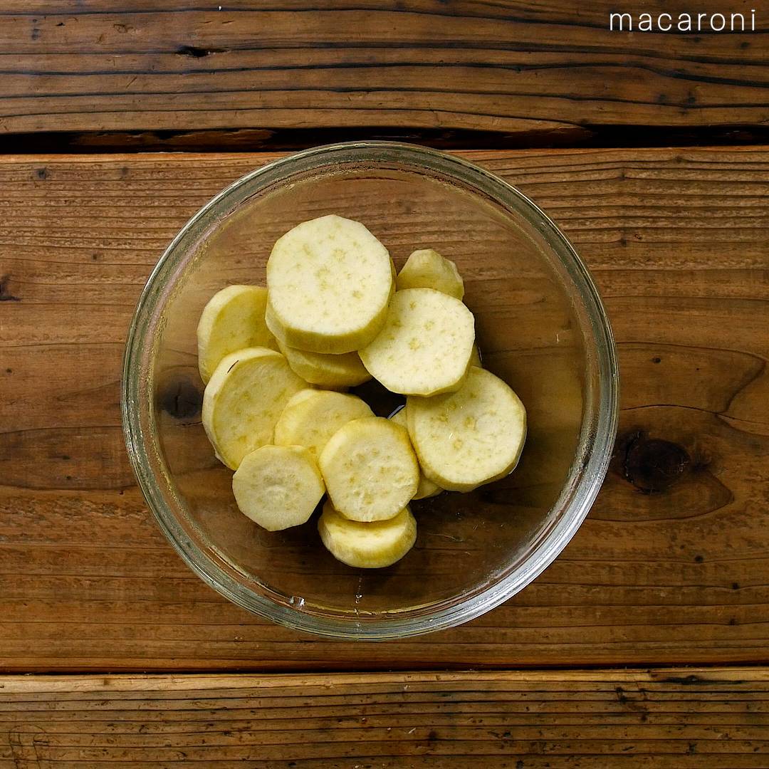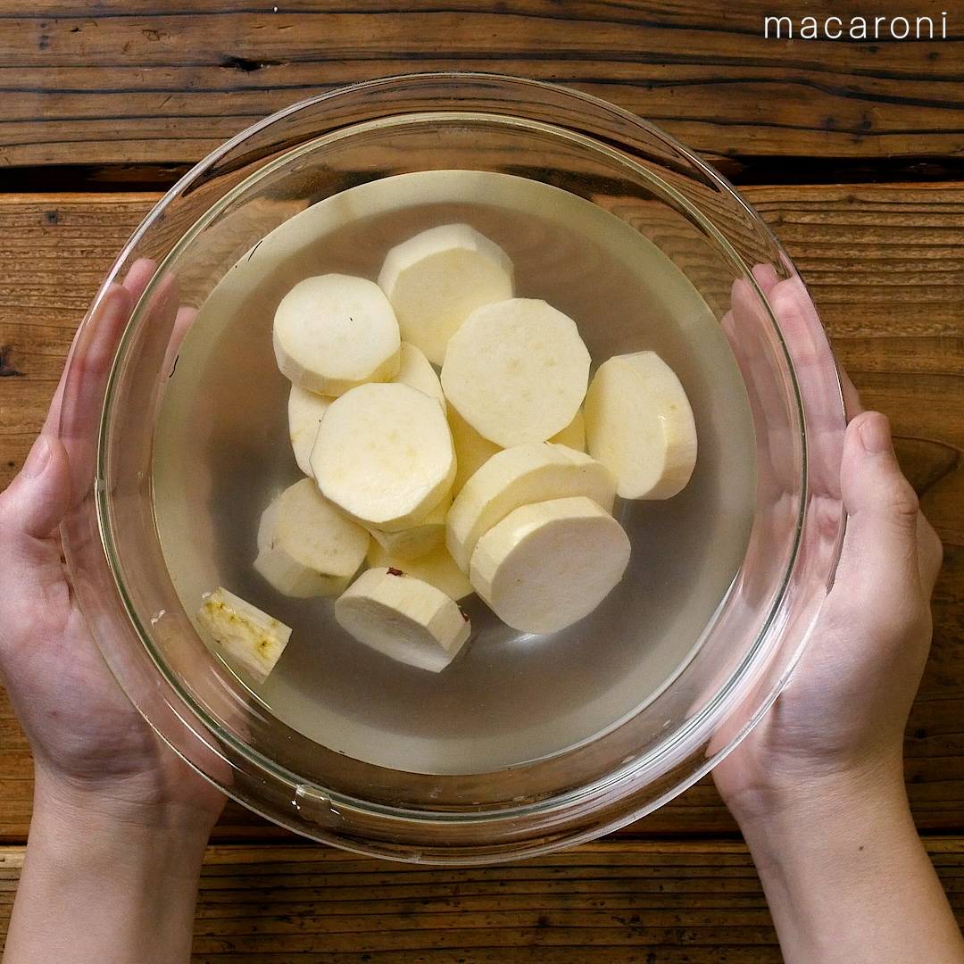 1: さつまいもは1cm厚の輪切りにし、皮をむきます。水に10分ほどつけてアク抜きをします。